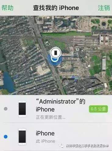 7.当手机定位成功后就可以看到地图上面显示两部苹果手机的定位位置。蓝色小点是目前个人所处在的苹果手机位置,另一个被定位的位置的苹果手机以iPhone图标显示出来。个人对定位进行比较了一下,苹果手机定位位置非常准确!