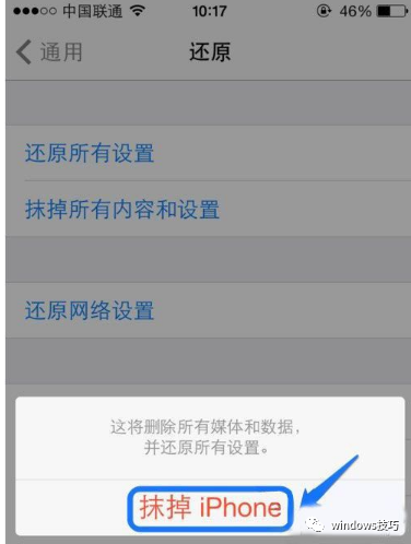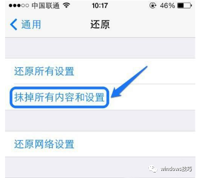 进入还原页面,想要恢复出厂设置的话,选择抹掉所有内容和设置。