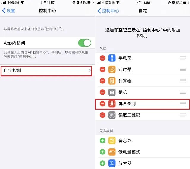 2、下载安装后,首先需要进入 设置 -> 控制中心 -> 自定义控制 -> 屏幕录制 添加进来,如图。