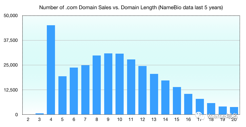 下图展示了.com域名过去5年的销售数据,在大约16个字符的长度范围内,所有域名的销售数量都相当强劲。这可能表明了很多是2个单词组合的域名,因为许多单词通常在6 ~9 个字母之间。