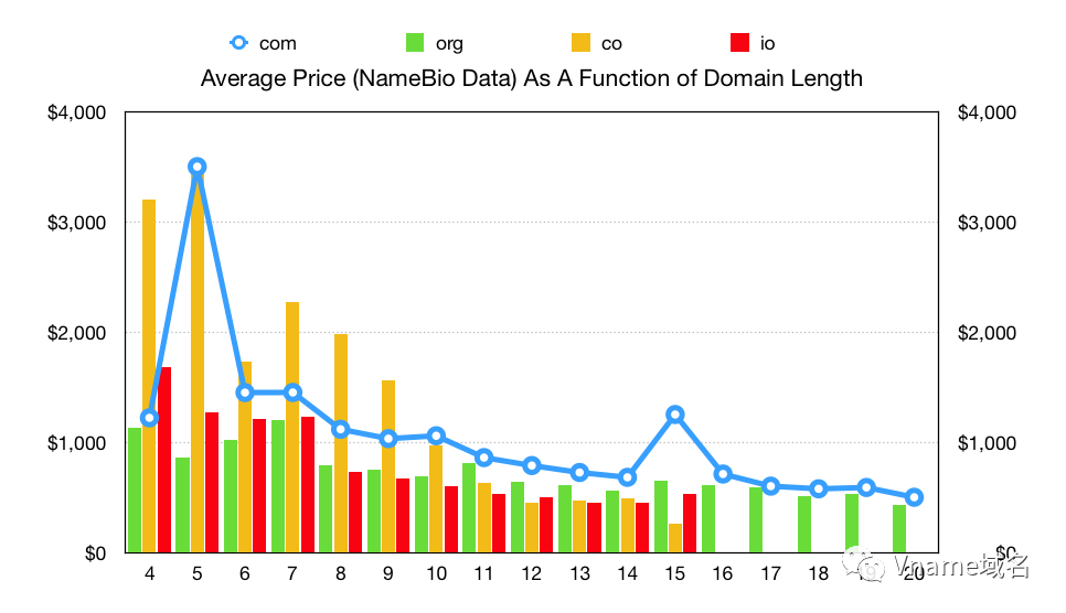 下图表示在过去5年中,4个曝光度高的域名.com、.org、.co、.io的域名长度和销售价格变化。(数据来源:NameBio)