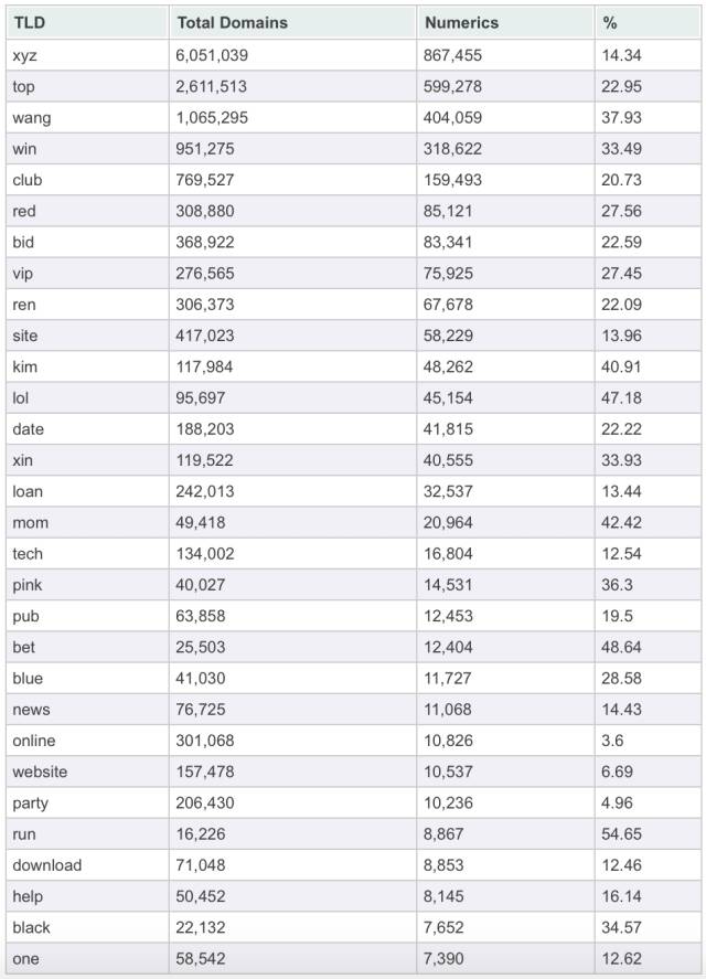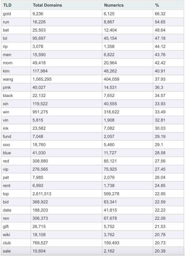 .club, .wang, .top 和 .xyz的5数字域名99%都被注了;.win的数95%被注了。超过10个顶级域名的4数99%被注了,16个顶级域名的4数超过90%被注册了。36个顶级域名90%的3数字被注册了。