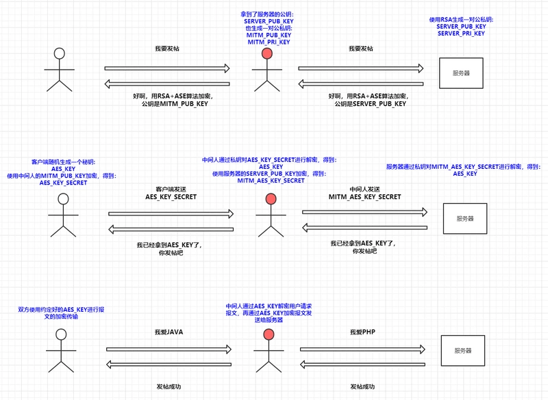 所谓道高一尺魔高一丈,中间人为了对应这种加密方法又想出了一个新的破解方案,既然拿不到AES_KEY,那我就把自己模拟成一个客户端和服务器端的结合体,在用户->中间人的过程中中间人模拟服务器的行为,这样可以拿到用户请求的明文,在中间人->服务器的过程中中间人模拟客户端行为,这样可以拿到服务器响应的明文,以此来进行中间人攻击: