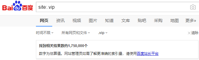 目前也有很多企业终端启用.vip后缀域名来建站,仅在百度,就有175万个是通过网站查询获得的。当然站点数据只是作为一个简单的参考,实际数据会远远超过站点数据。