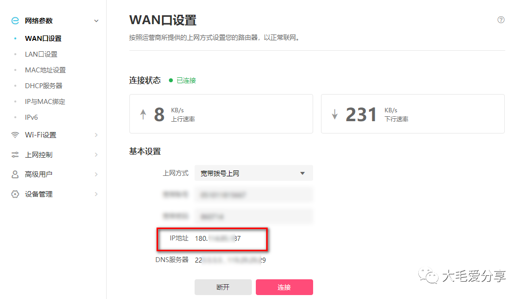 那么如何检测你家里的宽带是否是动态公网ip呢?最简单的方法就是:登录你的路由器一般在WAN设置里查看你的ip如下图: