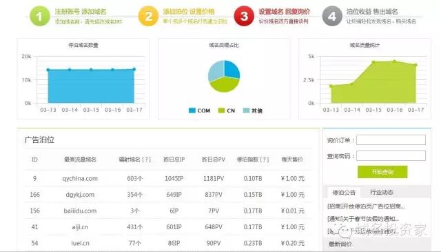 如果你有一个理想的域名或者带有流量的域名,但你又不想立即使用域名建立网站,这时你可以把你的域名放到域名停放服务商那里,通过广告赚取收益分成(虽然收益很少),国内的推荐去停泊网,网外有sedo等。