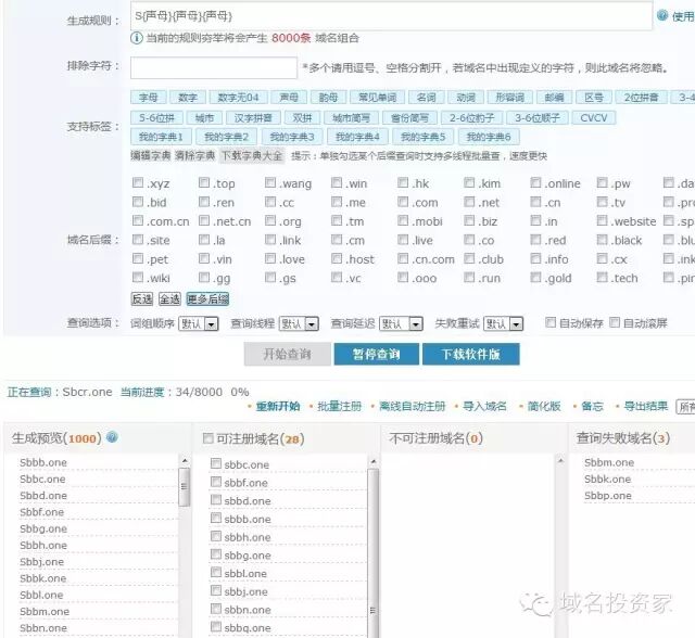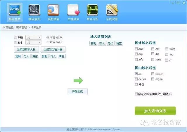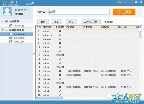 DomainName:易名的查询软件,查询速度快,成功率很高,操作方便,但仅支持com、net、org、top、cc、name、cn、com.cn等主流后缀的查询,自带生成本地米表的功能,但不支持筛选,可导入自己生成的米表。