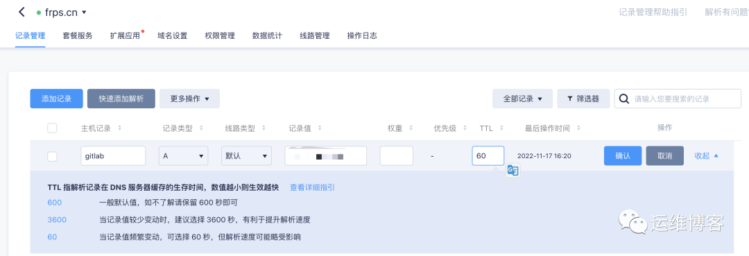 location ^~ /{proxy_pass http://127.0.0.1:1801/;proxy_set_header Host$host;proxy_set_header X-Real-IP$remote_addr;proxy_set_header X-Forwarded-For$proxy_add_x_forwarded_for;proxy_set_header REMOTE-HOST$remote_addr;add_header X-Cache$upstream_cache_status;}接下来进行DNSPOD域名解析