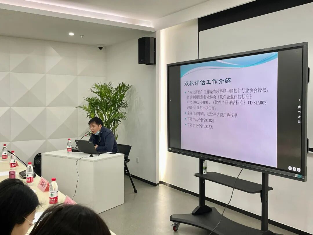 江苏省软件行业协会双软评估部汤昂老师首先为企业讲解《双软评估申报流程》。围绕双软评估的申报流程展开详细解读,为参会企业逐一梳理申报程序、企业指标、必备材料等细则。