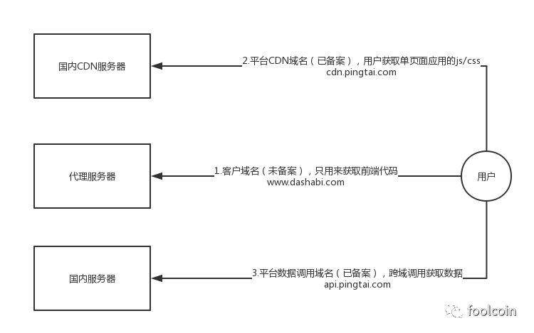 不过后来用户还是觉得慢,实际上是真的一点都不满。但是用户是爹,怎么办呢,改呗。因为数据请求实际上已经走了指向国内的域名,所谓的慢,主要在于用户第一次请求前端页面时较大的js、css文件,这种时候就只能上CDN了。改成了如下图所示。
